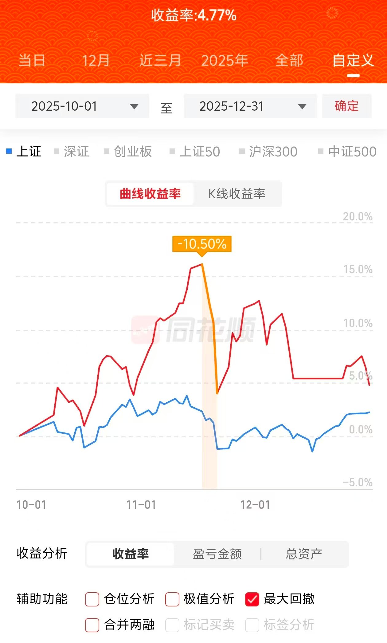 - 收益率:4.77%,经历了11月中和12初的2次较大振荡,控制了最大回测,收益曲线呈现波动上升趋势。