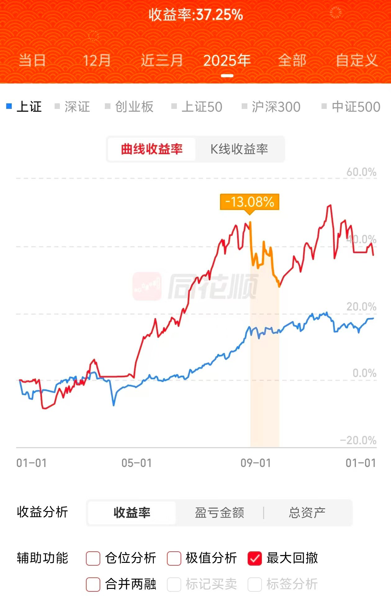 - 年度收益率:37.25%,整体来看收益集中在2-7月,8-12处于振荡,全年最大回测13.08好于去年,随着资金量的进一步,增大在牺牲一定收益的比例的情况下控制最大回测显得格外重要。